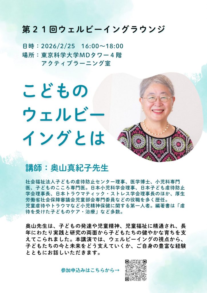 2026年2月25日(水)16時から、社会福祉法人子どもの虐待防止センター理事、医学博士、小児科専門医、子どものこころ専門医である奥山眞紀子先生をお招きし第21回ウェルビーイングラウンジ「こどものウェルビーイングとは」を開催します。