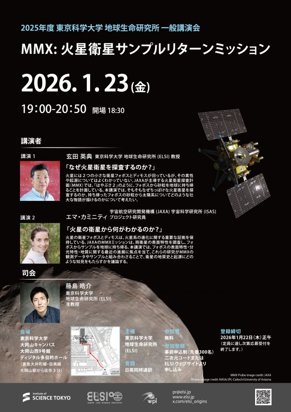 2026年1月23日(金)に東京科学大学 未来社会創成研究院 地球生命研究所(ELSI) 一般講演会を開催いたします。
