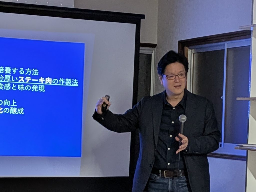 今回のワークショップでは「未来と肉?」という題で竹内教授から講演をいただきました。近年、動物の体外で細胞を増やしてつくる培養肉が注目を集めています。竹内研究室はマイクロ・ナノデバイス技術を先導してきた研究室で、技術を応用した培養肉の研究でも有名です。