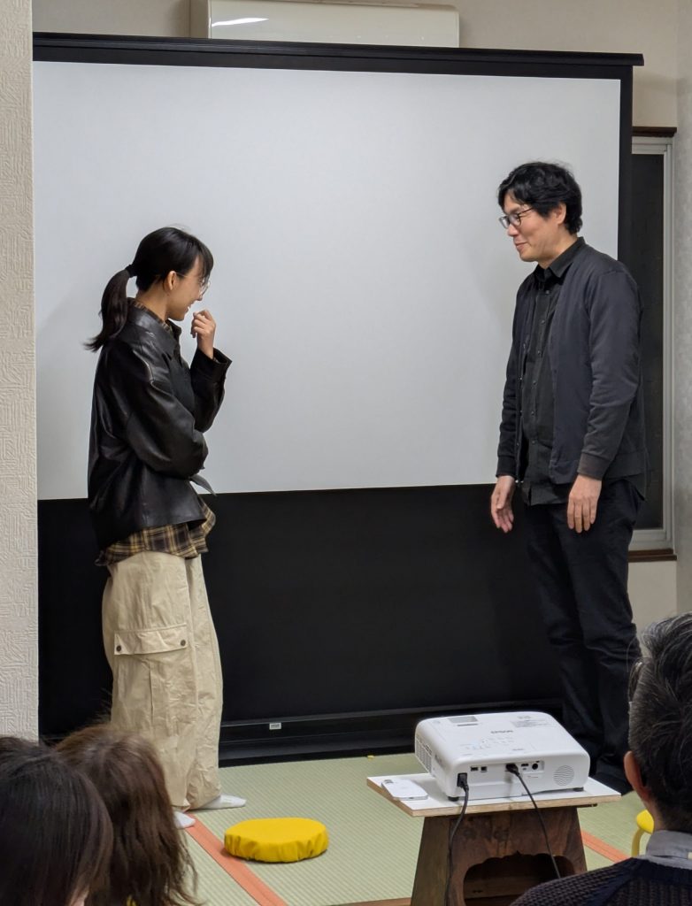 ディスカッションの途中、高尾隆教授(東京科学大学リベラルアーツ研究教育院)と高尾ゼミの学生さんによって「食べられるロボット」をモチーフにしたインプロ(即興劇)が披露され、場はおおいに盛り上がりました。インプロでは、台本がなく、演者がその場でアドリブで劇を進行します。――食べるものが無くなってしまった世界でロボットが「私を食べてください」と人間に申し出る。人間は「いや、いいです、大丈夫です」と最初は断るが、ロボットは「食べなければ死んでしまいますよ」と人間を説得する。人間は躊躇いつつ、「でもどうやって食べますか?」とロボットに問いかける――(インプロの途中までの概要)。竹内教授は、まさに自分が考えていたような場面・ストーリーだと感嘆されていました。