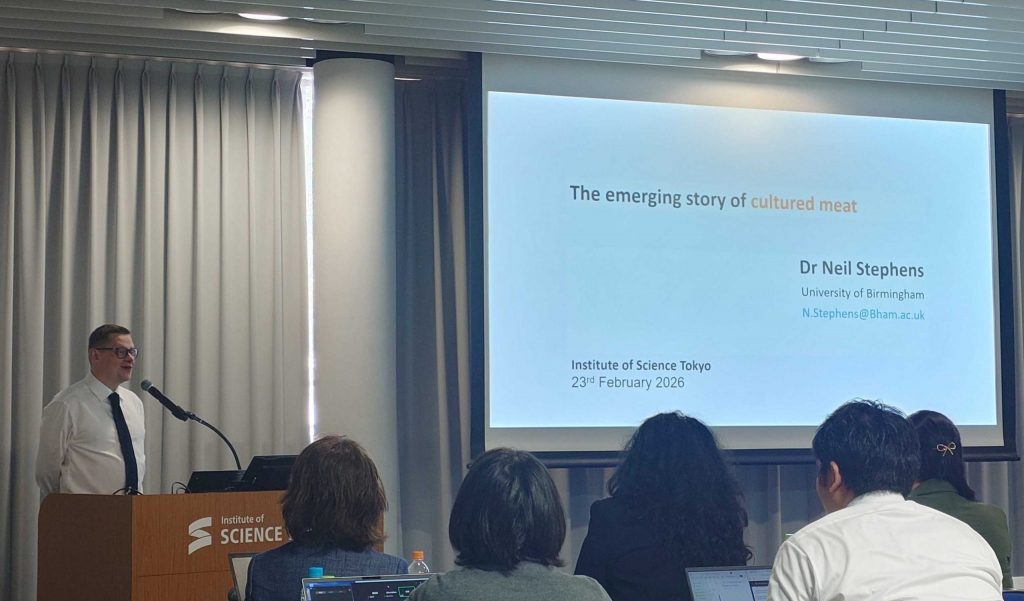 最初に、Neil Stephens博士(University of Birmingham)より『The emerging story of cultured meat』というタイトルで講演が行われました。Stephens博士は、2000年代前半に実験室で培養肉が研究され始めた頃から観察やインタビューを行ってきた当該分野の第一人者です。当時、細胞を増やして食用の肉を作る研究はただの変わった取り組みと見なされていました。培養肉は、肉というカテゴリーにもおさまらず、再生医療というカテゴリーにもおさまりません。こうした特性を指して、Stephens博士は培養肉がas yet undefined ontological object(いまだ定義されない存在的対象)だったと説明します。しかしこの状況は2013年を境に変わります。Mark Post博士の培養肉試食会をきっかけに培養肉には「牛肉の代替である」という強い意味が与えられ、それにともない議論される課題も――例えば資金調達の困難から人材不足へと――変化します。そして2026年の現在は「牛肉の代替である」という意味付け自体を塗り替える代替的な想像(alternative imaginary)が登場し始めていることをStephens博士は指摘しました。